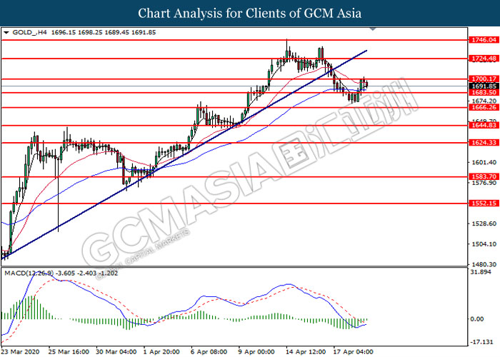 GOLD_, H4: Gold price was traded lower following prior retracement from the resistance level at 1700.15. However, MACD which illustrate diminishing bearish momentum suggest the pair to undergo technical correction toward the resistance level at 1700.15.