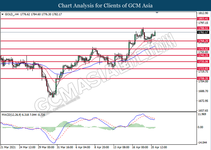 GOLD_, H4: Gold price was traded higher following prior rebound from the support level at 1768.20. MACD which illustrated diminishing bearish momentum signal suggest the commodity to extend its gains toward the resistance level at 1788.50.