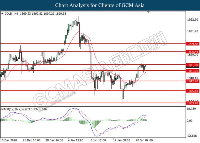 GOLD_, H4: Gold price was traded higher following prior rebound from the support level at 1861.05. MACD which illustrated diminishing bullish momentum suggest the commodity to undergo technical correction in short term.