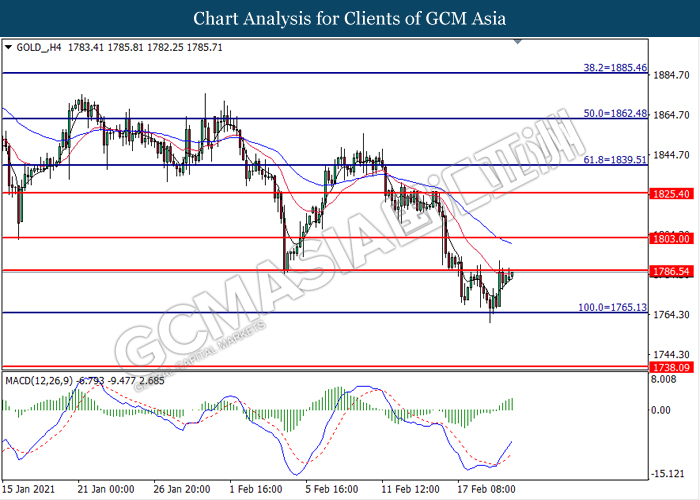 GOLD_, H4: Gold price was traded higher while currently testing the resistance level at 1786.55. MACD which illustrated bullish bias momentum suggest the commodity to extend its gains after it successfully breakout above the resistance level.