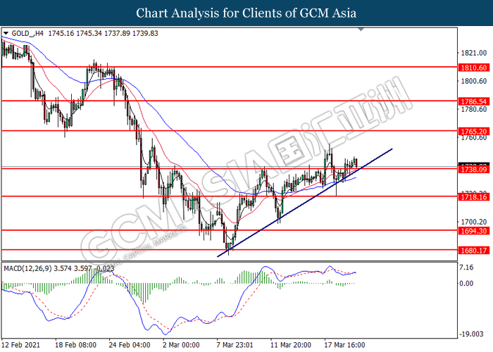 GOLD_, H4: Gold price was traded higher following prior breakout above the previous resistance level at 1738.10. MACD which illustrated diminishing bearish momentum signal suggest the commodity to extend its gains toward the resistance level at 1765.20.