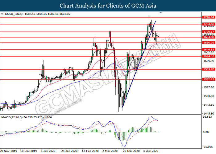 GOLD_, Daily: Gold price was traded lower while currently testing the support level at 1683.50. MACD which illustrate bearish momentum signal with the formation of death cross suggest the commodity to extend its losses after it successfully breakout below the support level.