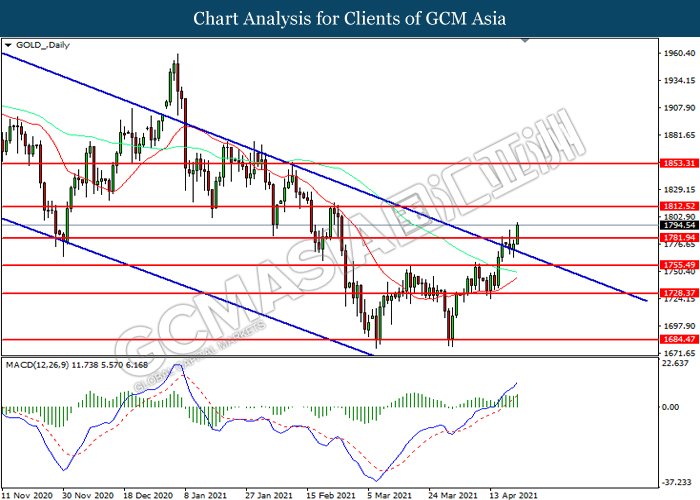 GOLD_, Daily: Gold price was traded higher following prior breakout above the previous resistance level at 1781.95. MACD which illustrated increasing bullish momentum suggest the commodity to extend its gains toward resistance level at 1812.50.