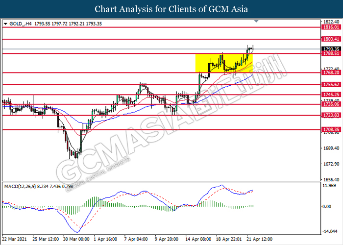 GOLD_, H4: Gold price was traded higher following prior breakout above the previous resistance level at 1788.50. MACD which illustrated bullish bias momentum signal suggest the commodity to extend its gains toward the resistance level at 1803.40.