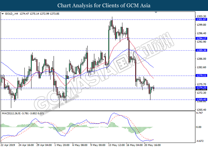 GOLD_, H4: Gold price was traded higher following recent rebound from the support level 1269.40. MACD which illustrate bullish momentum signal with the formation of golden cross suggest the commodity to extend its gains after it successfully breaks above the resistance level 1274.25.