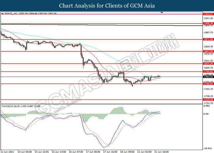 GOLD_, H1: Gold price was traded higher following prior rebound from the support level at 1766.85. However, MACD which illustrated diminishing bullish momentum suggest the commodity to be traded lower in short-term as technical correction.