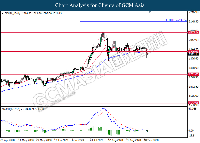 GOLD_, Daily: Gold price was traded lower following prior breakout below the support level at 1926.40. MACD which illustrated bearish bias momentum suggest the commodity to extend its losses toward the support level at 1761.65.