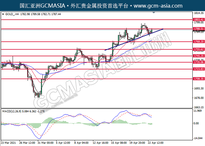 GOLD_, H4: Gold price was traded higher following prior rebound from the upward trendline. MACD which illustrated diminishing bearish momentum signal suggest the commodity to extend its gains toward the resistance level at 1788.50.