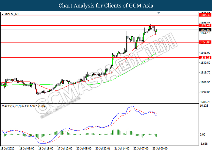 GOLD_, H1: Gold price was traded lower following prior retracement from the resistance level at 1884.35. MACD which illustrated increasing bearish momentum suggest the commodity to extend its losses toward support level at 1853.85.