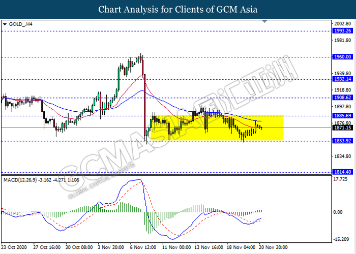 GOLD_, H4: Gold price remain traded in a sideway channel. However, MACD which illustrate bullish momentum signal suggested the commodity to be traded higher in short term towards the resistance level 1885.70.