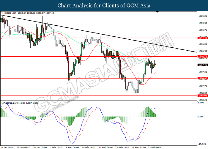 GOLD_, H4: Gold price was traded higher while currently near the resistance level at 1818.80. However, MACD which illustrated diminishing bullish momentum suggest the commodity to be traded lower in short-term as technical correction.