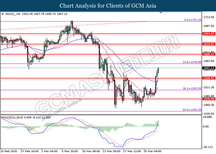 GOLD_, H4: Gold price was traded higher following prior breakout above the previous resistance level at 1536.95. MACD which illustrate bullish bias momentum signal suggest the commodity to extend its gains toward the resistance level at 1579.00