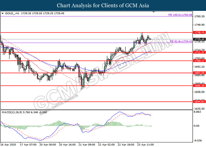 GOLD_, H1: Gold price was traded lower following prior retracement from the higher level. MACD which illustrate bearish bias momentum signal suggest the commodity to extend its losses toward the support level at 1724.45.