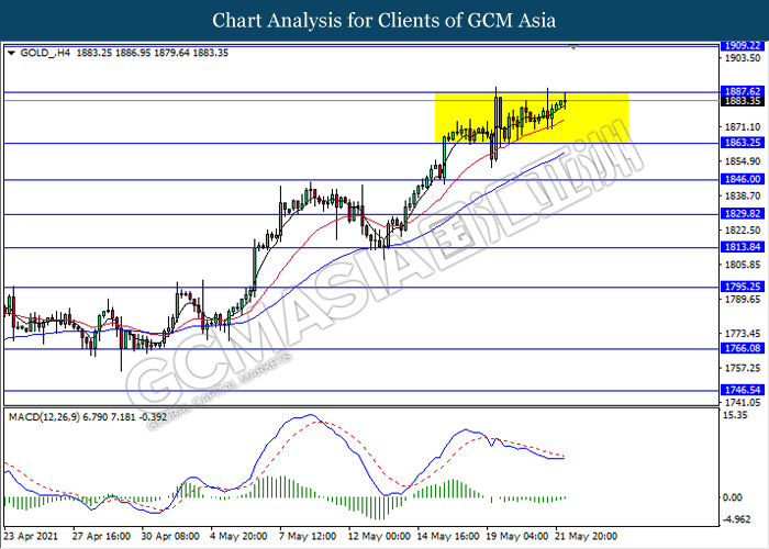 GOLD_, H4: Gold price remain traded in a sideway channel while currently testing near the resistance level 1887.60. However, MACD which illustrate diminishing bearish momentum suggest the commodity to be traded higher after it breaks above the resistance level.