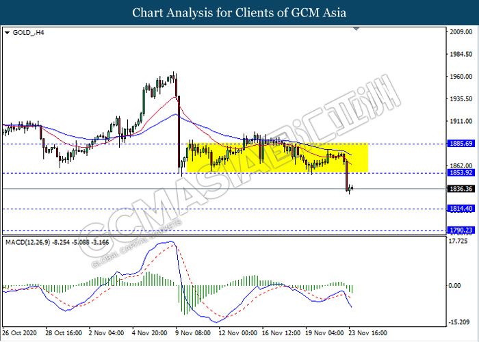 GOLD_, H4: Gold price was traded lower following prior breakout below the previous support level 1853.90. MACD which illustrate bearish momentum signal with the formation of death cross suggest the commodity to extend its losses towards the support level 1814.40.