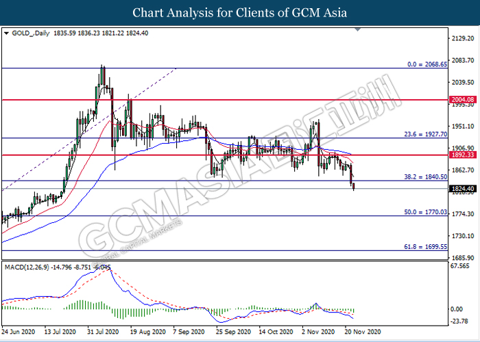 GOLD_, Daily: Gold price was traded lower following prior breakout below the previous support level at 1840.50. MACD which illustrate bearish bias momentum suggest the commodity to extend its losses toward the support level at 1770.05.