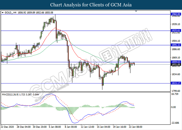GOLD_, H4: Gold price was traded flat while currently testing the resistance level 1859.65. However, MACD which illustrate bearish momentum signal suggest the commodity to be traded lower towards the support level 1815.15.