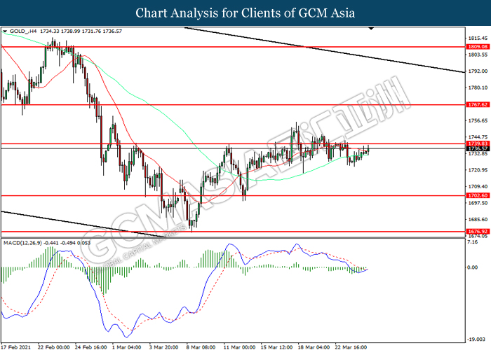 GOLD_, H4: Gold price was traded higher while currently testing the resistance level 1739.85. MACD which illustrated diminishing bearish momentum suggest the commodity to extend its gains after it successfully breakout above the resistance level.