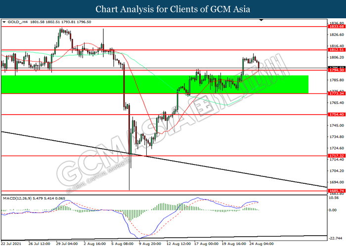 GOLD_, H4: Gold price was traded lower while currently testing the support level at 1794.30. MACD which illustrated diminishing bullish momentum suggest the commodity to extend its losses after it successfully breakout below the support level.