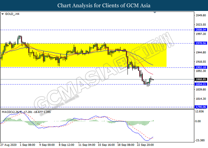 GOLD_, H4: Gold price was traded higher following prior rebound from the support level 1854.20. MACD which illustrate bullish momentum signal with the formation of golden cross suggest the commodity to extend its rebound towards the resistance level 1902.20.