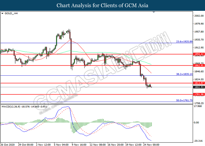 GOLD_, H4: Gold price was traded lower following prior breakout below the previous support level at 1813.95. However, MACD which illustrated diminishing bearish momentum suggest the commodity to be traded higher in short-term as technical correction.