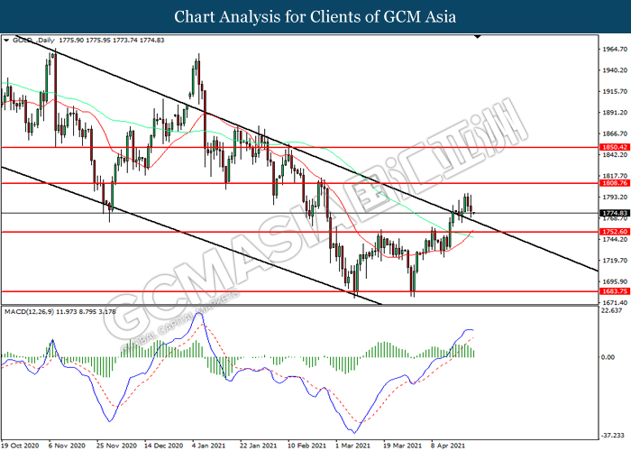 GOLD_, Daily: Gold price was traded lower following prior retracement from the resistance level at 1808.75. MACD which illustrated diminishing bullish momentum suggest the commodity to extend its losses toward support level at 1752.60.