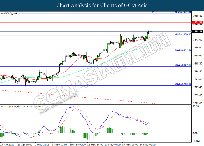 GOLD_, H4: Gold price was traded higher following prior breakout above the previous resistance level at 1886.95. MACD which illustrated increasing bullish momentum suggest the commodity to extend its gains toward resistance level at 1921.30.