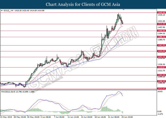 GOLD_, H1: Gold was traded lower while currently testing the support level at 1415.00. MACD which illustrate bearish momentum and the formation of death cross suggest the pair to extend its losses after successfully breakout below the support level at 1415.00.