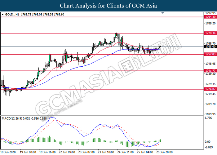 GOLD_, H1: Gold price was traded higher following prior rebound from the support level at 1757.85. MACD which illustrate bullish bias momentum suggest the pair to extend its gains toward the resistance level at 1778.35.