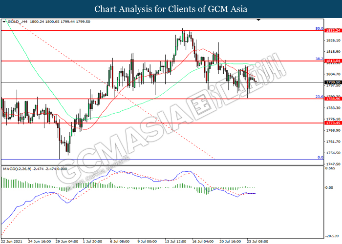 GOLD_, H4: Gold price was traded lower following prior retracement from the resistance level at 1813.05. MACD which illustrated diminishing bullish momentum suggest the commodity to extend its losses toward support level at 1788.95.