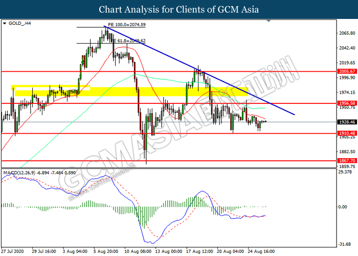 GOLD_, H4: Gold price was traded higher following prior rebound from the support level at 1910.50. MACD which illustrated increasing bullish momentum suggest the commodity to extend its gains toward resistance level at 1956.60.