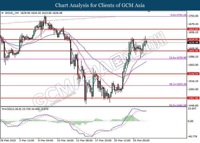GOLD_, H4: Gold price was traded lower following prior retracement from the resistance level at 1634.90. Due to lack of signal from MACD, it is suggested to wait for further confirmation before entering into market.