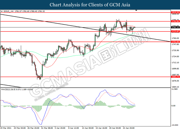GOLD_, H4: Gold price was traded higher following prior rebound from the support level at 1772.85. MACD which illustrated diminishing bearish momentum suggest the commodity to extend its gains toward resistance level at 1792.85.