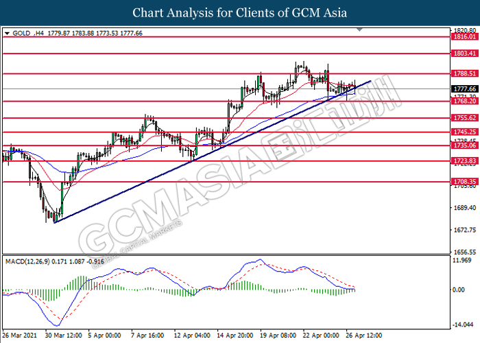 GOLD_, H4: Gold price was traded lower while currently testing the upward trend line. MACD which illustrated bearish bias momentum signal suggest the commodity to extend its losses after it successfully breakout below the upward trend line.