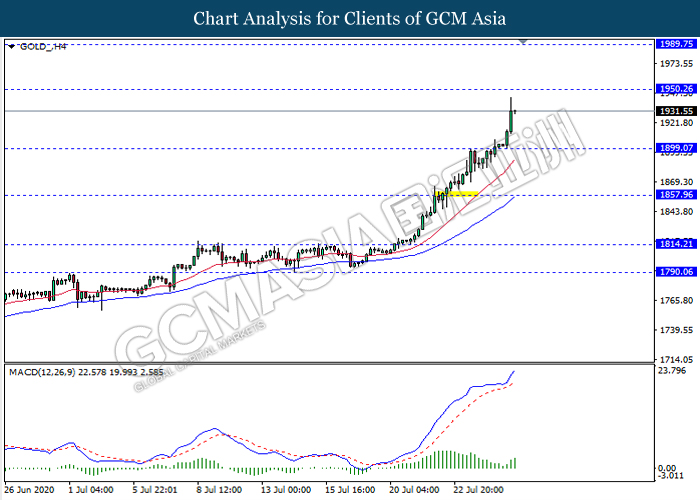 GOLD_, H4: Gold price was traded higher following recent breakout above the previous resistance level 1899.05. MACD which illustrate diminishing bearish momentum signal suggest the commodity to extend its gains towards the resistance level 1950.25.