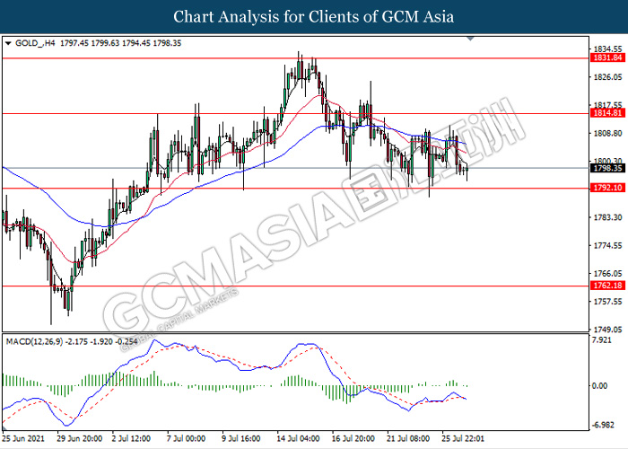 GOLD_, H4: Gold price was traded lower while currently testing near the support level 1792.10. MACD which illustrate bearish momentum signal with the formation of death cross suggest the commodity to extend its losses after it breaks below the support level.