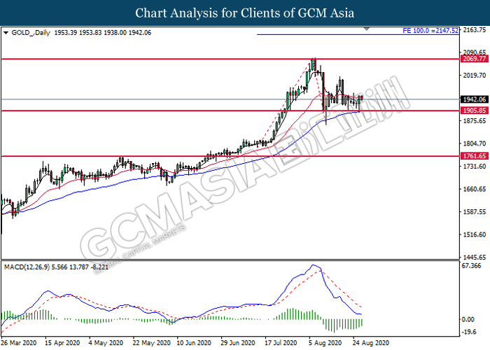 GOLD_, Daily: Gold price was traded higher following prior rebound from the support level at 1905.85. MACD which illustrate diminishing bearish momentum signal suggest the commodity to extend its gains toward the resistance level at 2069.75.