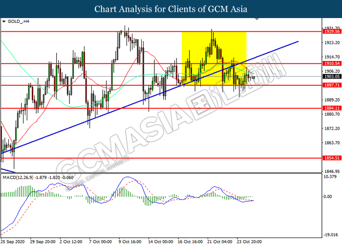 GOLD_, H4: Gold price was traded higher following prior rebound from the support level at 1897.70. MACD which illustrated diminishing bearish momentum suggest the commodity to extend its gains toward resistance level at 1910.55.