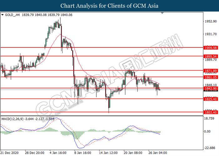 GOLD_, H4: Gold price was traded lower following prior breakout below the previous support level at 1842.90. MACD which illustrated bearish bias momentum suggest the commodity to extend its losses toward the support level at 1825.40.