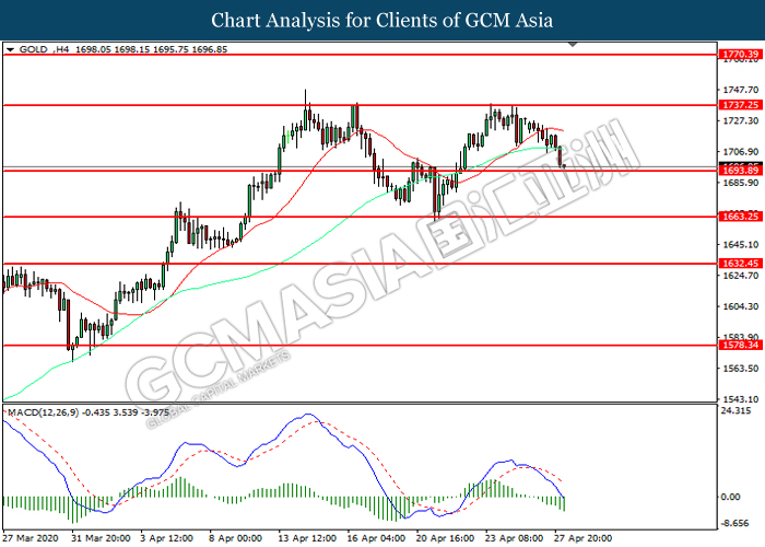 GOLD_, H4: Gold price was traded lower while currently testing the support level at 1695.90. MACD which illustrated increasing bearish momentum suggest the commodity to extend its losses after it successfully breakout below the support level.