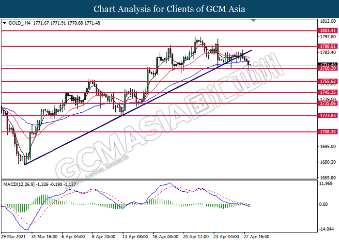 GOLD_, H4: Gold price was traded lower while currently testing the support level at 1768.20. MACD which illustrated bearish bias momentum signal suggest the commodity to extend its losses after it successfully breakout below the support level.