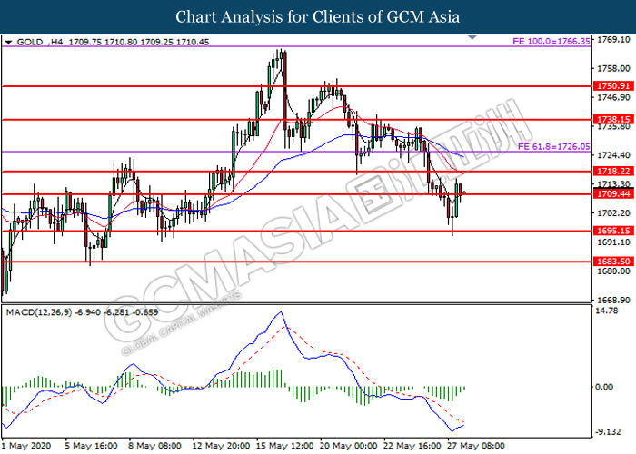 GOLD_, H4: Gold price was traded higher following prior breakout above the previous resistance level at 1709.45. MACD which illustrate diminishing bearish momentum signal suggest the commodity to extend its gains toward the resistance level at 1718.20.