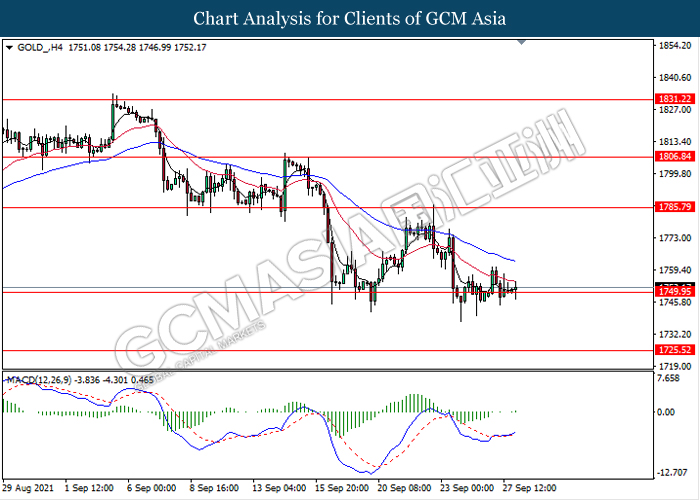 GOLD, H4: Gold price was traded flat while currently testing the support level 1749.95. However, MACD which illustrate bullish bias signal with the formation of golden cross suggest the commodity to be traded higher towards the resistance level 1785.80.