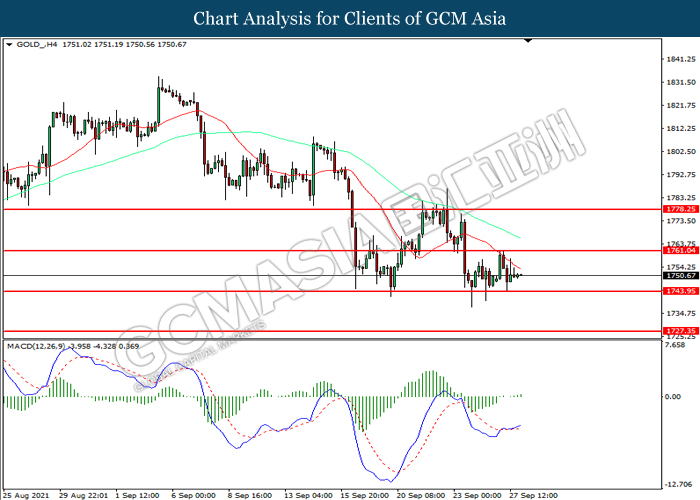 GOLD_, H4: Gold price was traded lower while currently testing the support level at 1761.05. MACD which illustrated increasing bullish momentum suggest the commodity to be traded higher in short-term as technical correction.