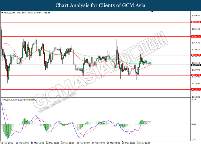 GOLD_, H1: Gold price was traded lower following prior retracement from the resistance level at 1735.75. MACD which illustrated diminishing bullish momentum suggest the commodity to extend its losses toward support level at 1723.75.