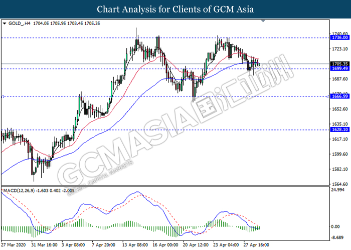 GOLD_, H4: Gold price was traded lower while currently testing near the support level 1699.50. However, MACD which illustrate diminishing bearish momentum suggest the commodity to experience a technical correction towards the resistance level 1736.00.