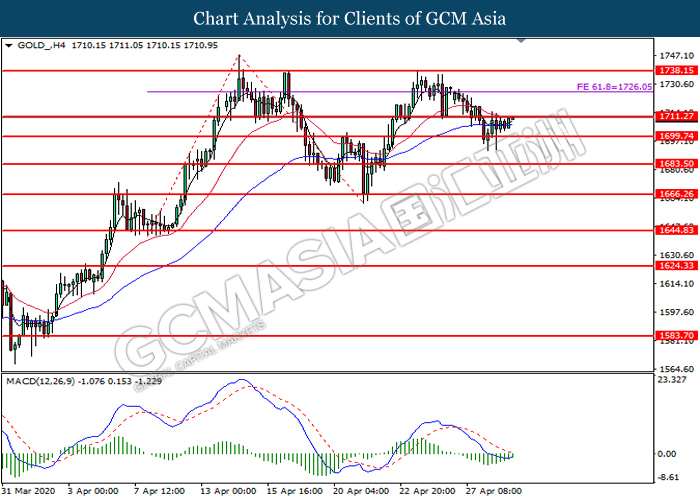 GOLD_, H4: Gold price was traded higher while currently testing the resistance level at 1711.25. MACD which illustrate diminishing bearish momentum signal suggest the commodity to extend its gains after it successfully breakout above the resistance level.