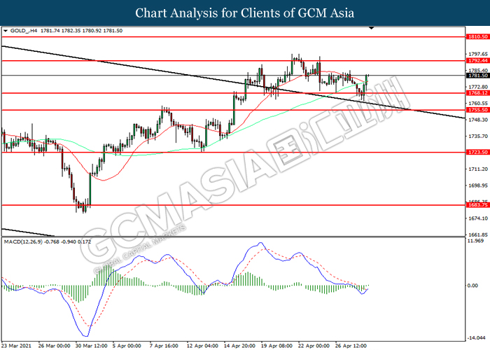 GOLD_, H4: Gold price was traded higher following prior rebound from the support level at 1768.10. MACD which illustrated diminishing bearish momentum suggest the commodity to extend its gains toward resistance level at 1792.45.