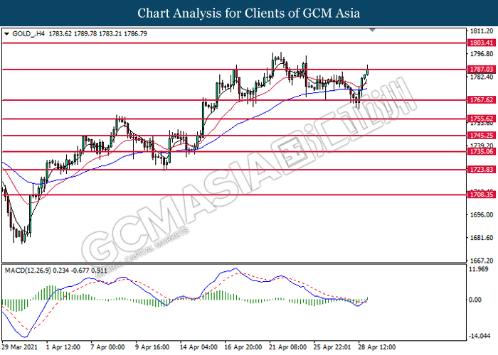 GOLD_, H4: Gold price was traded higher while currently testing the resistance level at 1787.05. MACD which illustrated bullish bias momentum signal suggest the commodity to extend its gains after it successfully breakout above the resistance level.