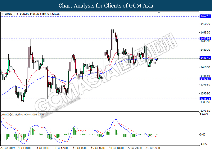 GOLD_, H4: Gold price was traded higher while currently testing the resistance level 1421.40. MACD which illustrate bullish bias signal with the starting formation of golden cross suggest the commodity to extend its gains after it breaks above the resistance level.
